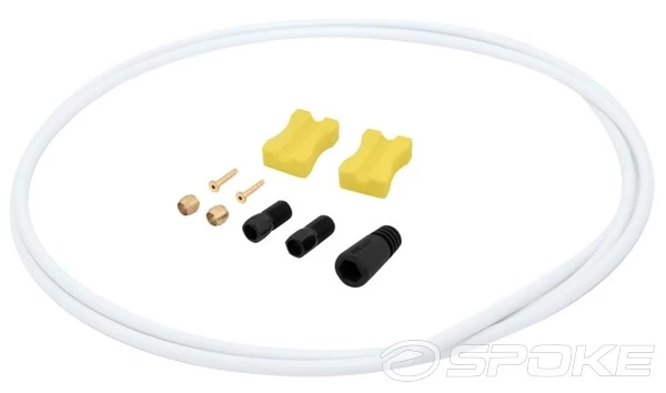 Replacement kit of white hose and ends for Shimano T615, M4050, M506, M505, M445, M395, M396, M355 hydraulic brakes. The kit includes a hose (100 cm for the front or 170 cm for the rear brake), 2x screws, 2x olive, 2x mandrel and 1x cover.