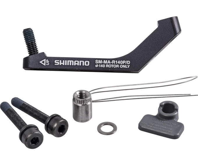 Shimano rear adapter for mounting Post mount bracket (74mm pitch) to Flat mount frame mount (34mm pitch) with 140mm blade.